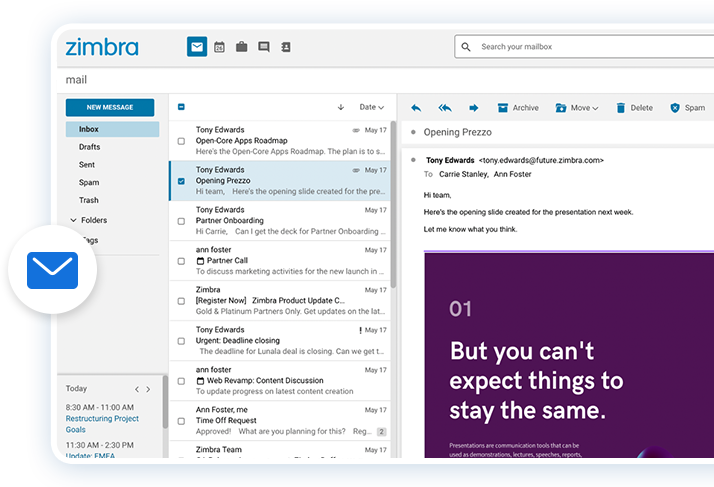 Zimbra es una plataforma de colaboración y correo electrónico de código abierto que ha ganado popularidad entre las empresas por su flexibilidad, escalabilidad y coste-efectividad. La solución incluye una serie de herramientas que facilitan la comunicación y colaboración, como correo electrónico, calendario, contactos, tareas y almacenamiento de archivos. La interfaz web de Zimbra es intuitiva y fácil de usar, permitiendo a los usuarios acceder a sus datos desde cualquier lugar con una conexión a internet.